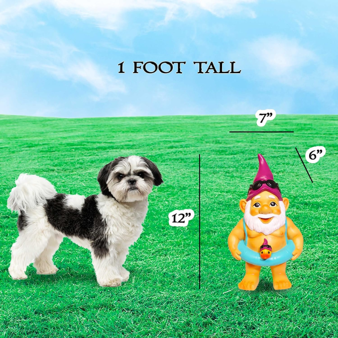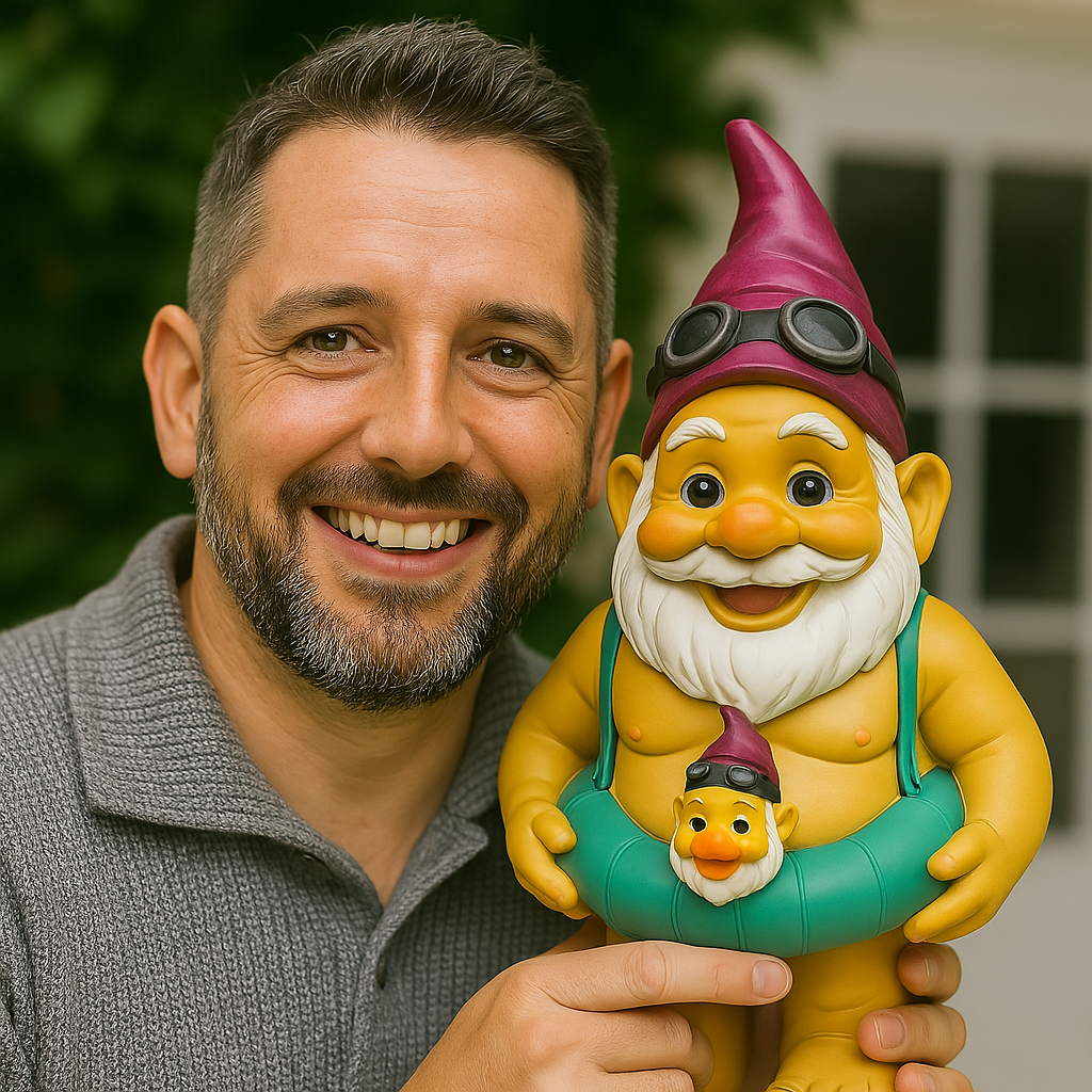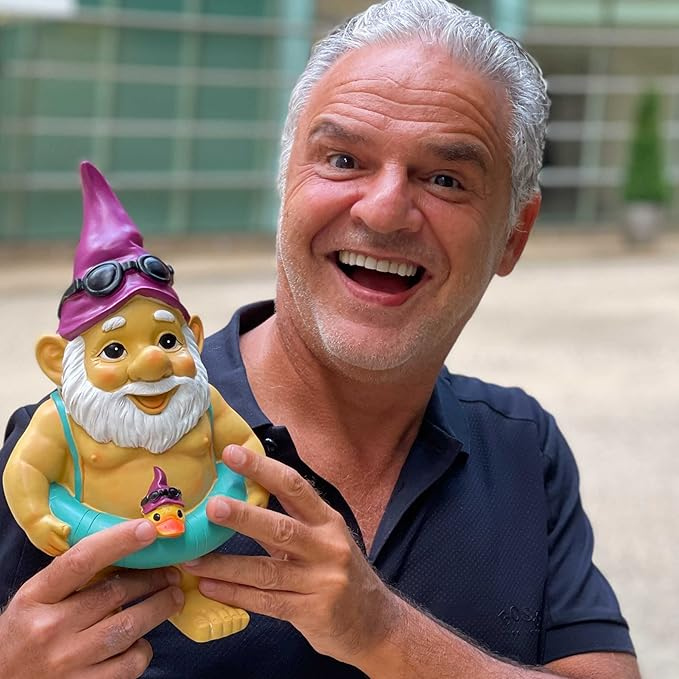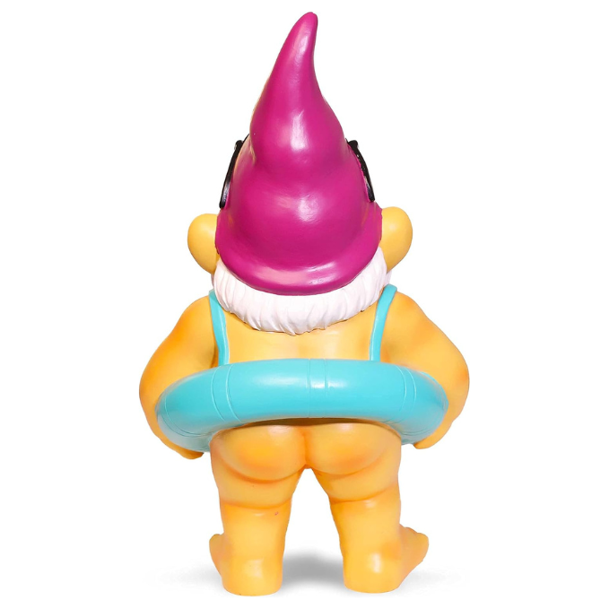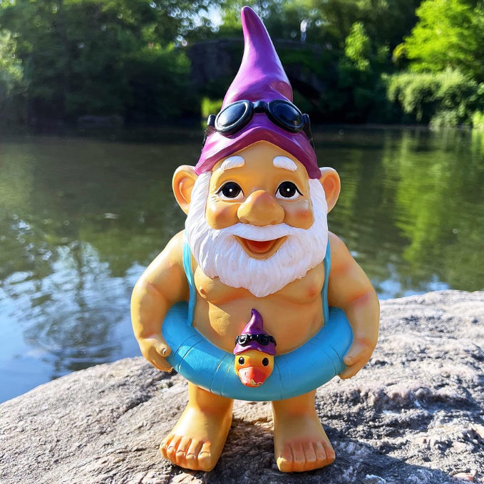 Armé de sa bouée canard et de son fidèle bonnet de bain violet, ce petit nain surveille votre jardin comme un vrai maître nageur… sauf qu’il ne nage pas (et qu’il s’endort souvent au soleil).
