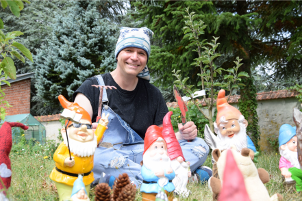 Entouré de ses fidèles compagnons de jardin, Jean-Yves prouve qu’on n’a jamais trop de nains pour être bien entouré. La magie opère… un sourire à la fois !